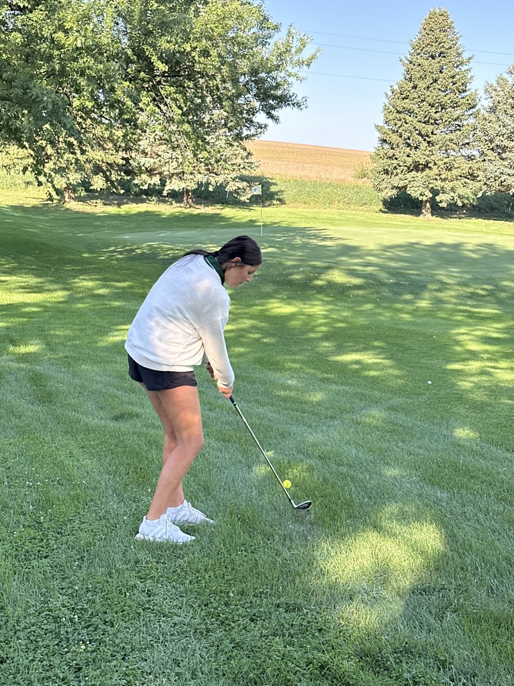 Ellie chips onto the green on Hole 2 in Battle Creek.